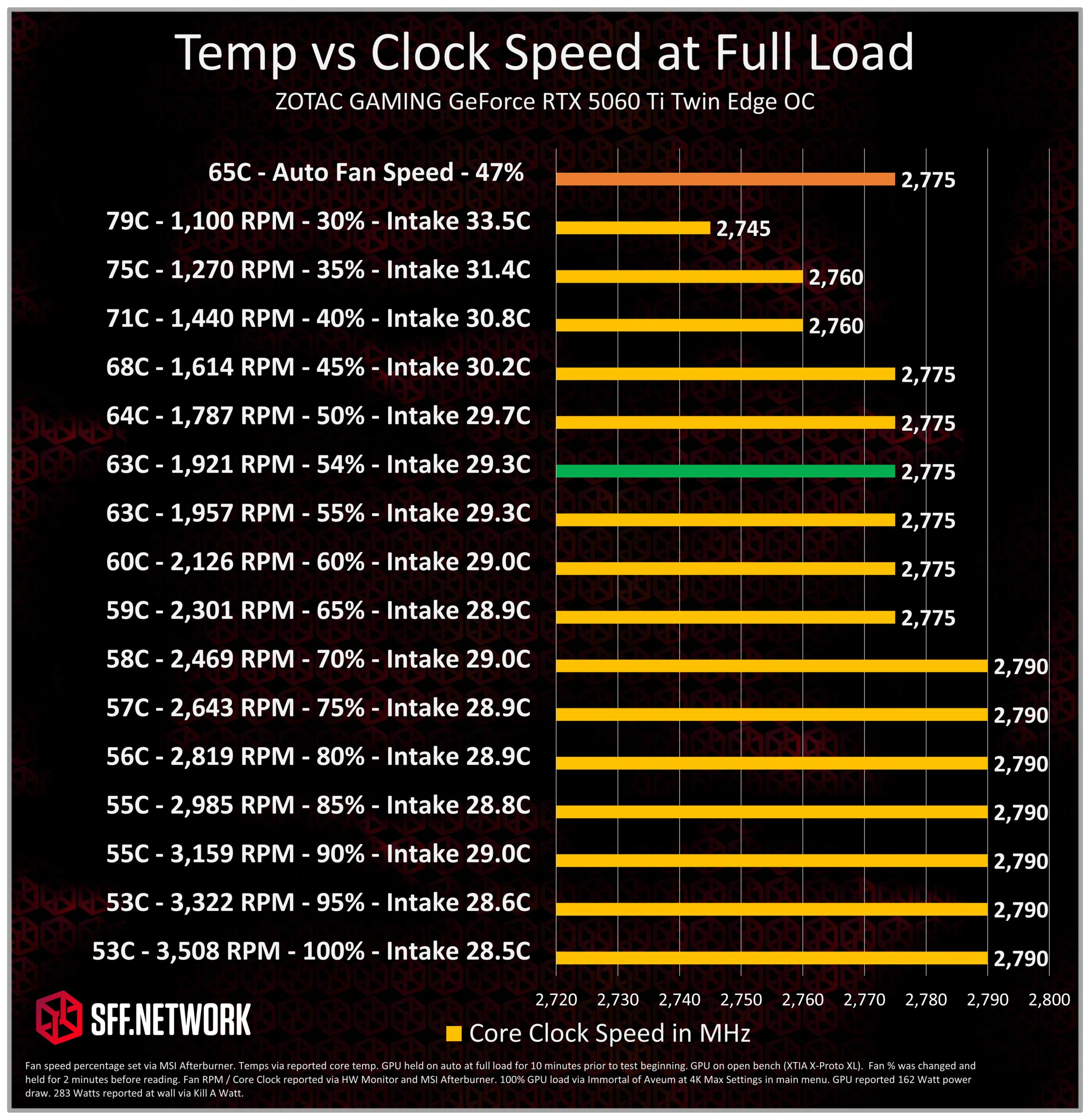 The Zotac Gaming RTX 5060Ti Twin Edge OC performed admirably in our temperature vs core clock test. Unlike the RTX 4070 Super Twin Edge which had a 200 MHz deviation at stock power levels, there was only a 45 MHz difference between 100% fan speed, and 30% fan speed at full load. Left to its own devices, the card settled in at 2,775 MHz.