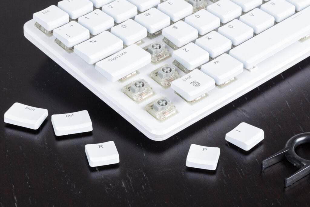 The keyboard is a 65%ish form factor, and uses Gateron KS-33 Blue switches, although confusingly with custom silver stalks. These keyswitches have RGB lighting, of course. Keycaps-wise, the Pi 500+ comes with low profile keycaps, in a painted, then laser etched, style. Only time will tell how long the paint will last in use. A keycap puller is included with the system.